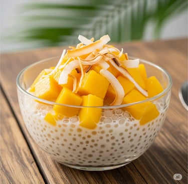 Blend fresh mangoes with milk or cream, then mix in your pearls. It’s like sunshine in a bowl.Breakfast Sago Bowl 🍌